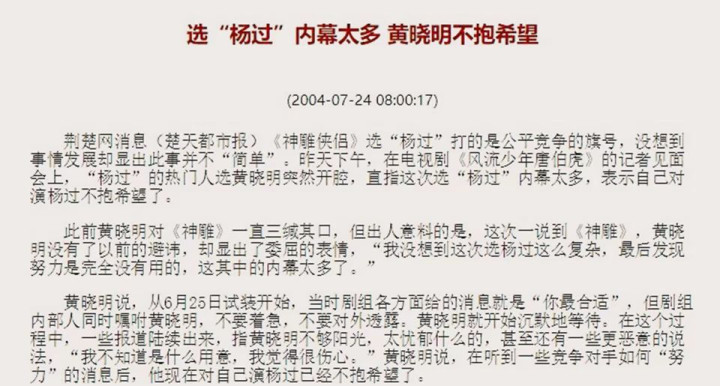 黄晓明还曾在镜头前表示,竞选“杨过”内幕太多,自己已经不抱希望了。